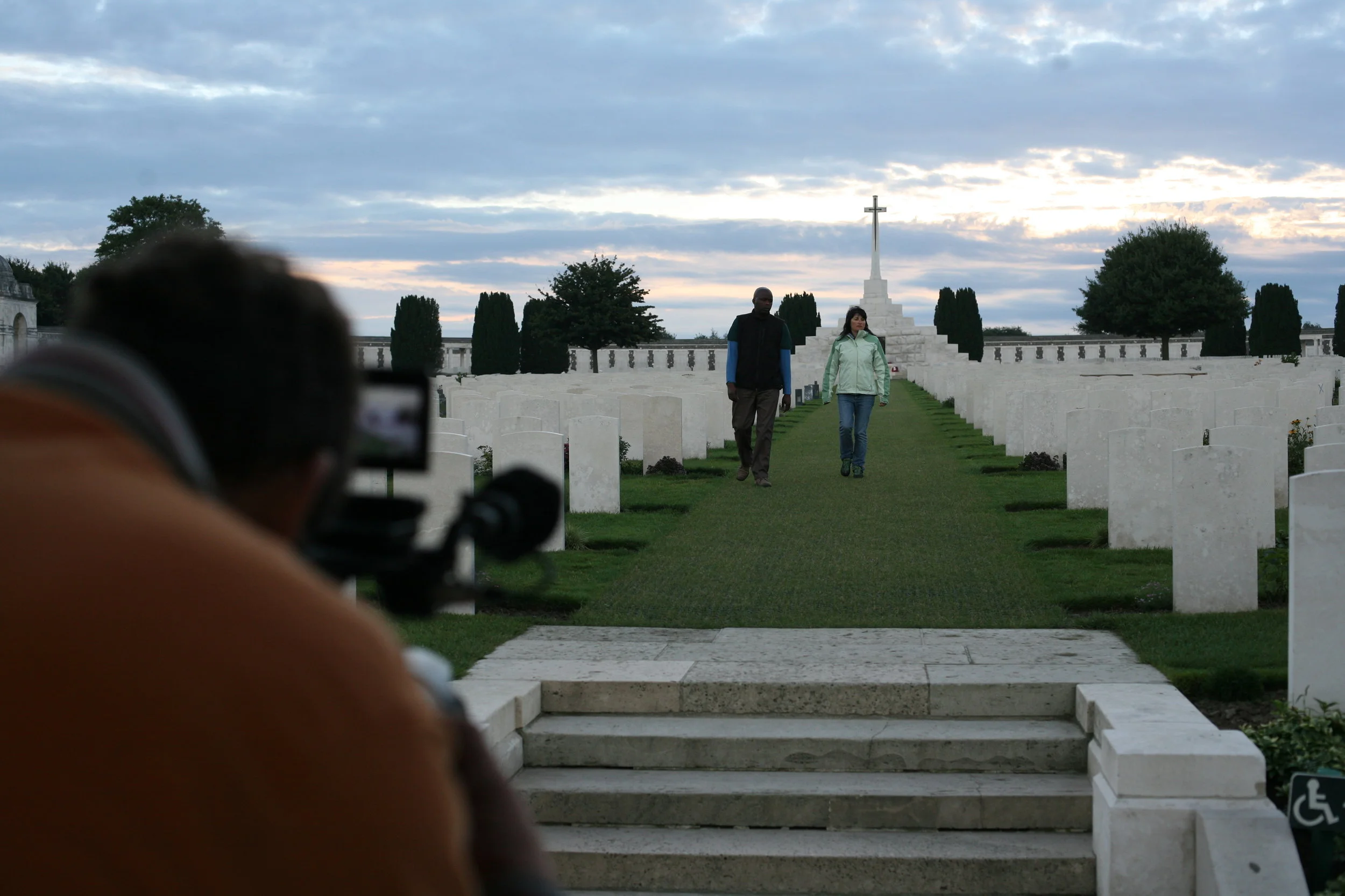 Talking to Zwai Mgijima, the narrator in Troopship Tragedy, late afternoon at the Commonwealth War Graves Commission cemetery at Arques-La-Batailles near Dieppe in France, 2013